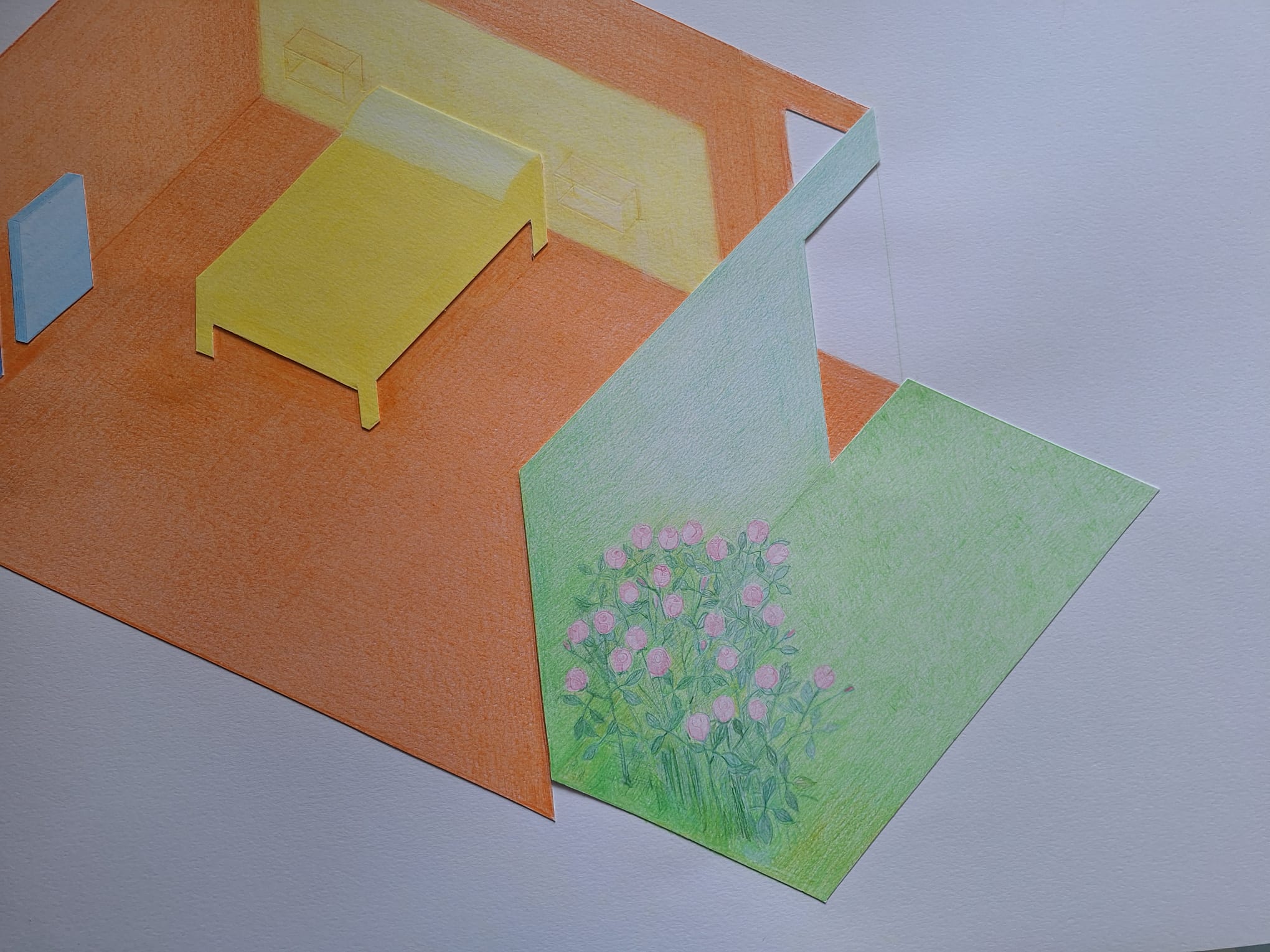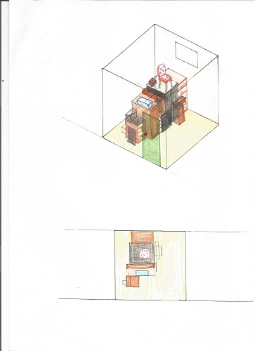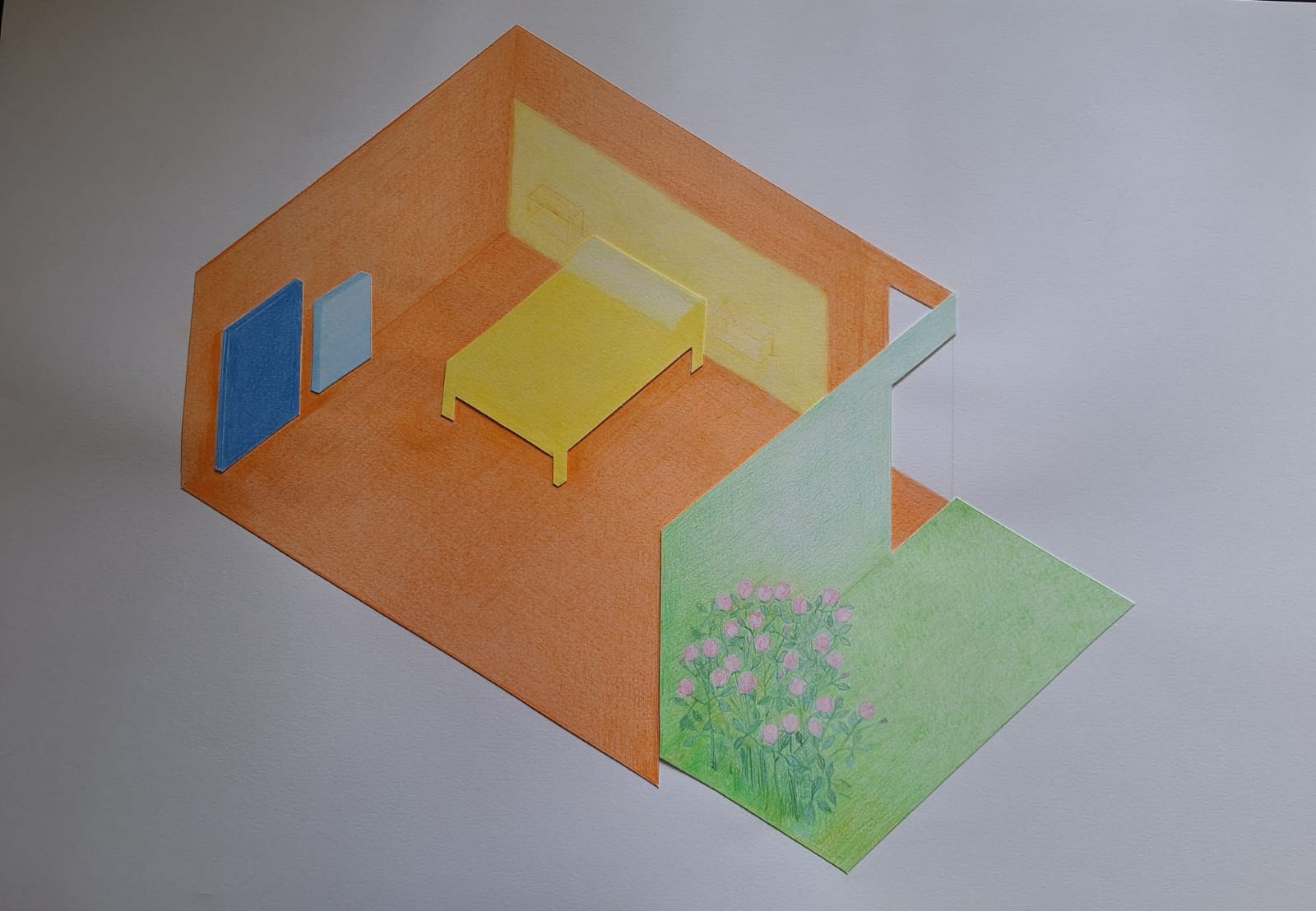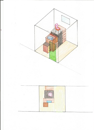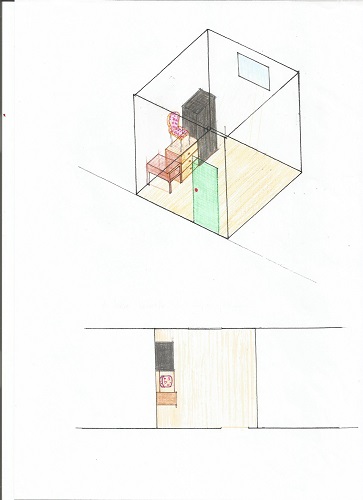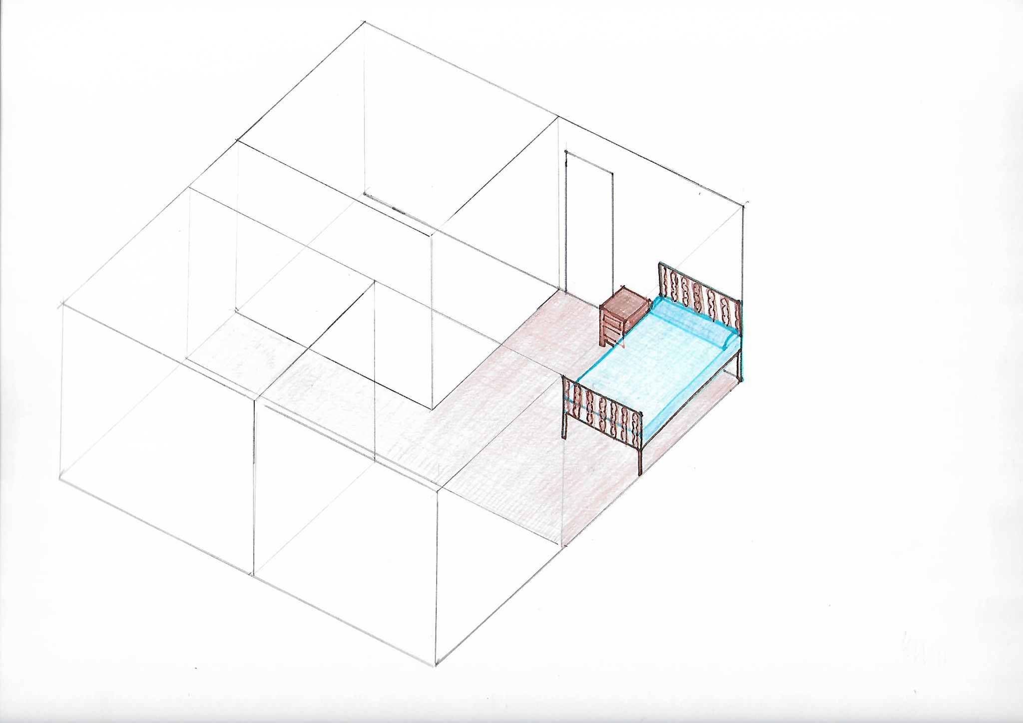 Ao ser unha recreación do dormitorio actual, suxiro que este debuxo se coloque nel, na parede da dereita para que poida ser visto dende a cama real.