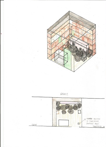 A súa idea é transformar este espazo nun lugar de encontro e benestar. O espazo no ten ventá, as paredes están cubertas de andeis, e hai roupa da nai en bolsas de lixo.
