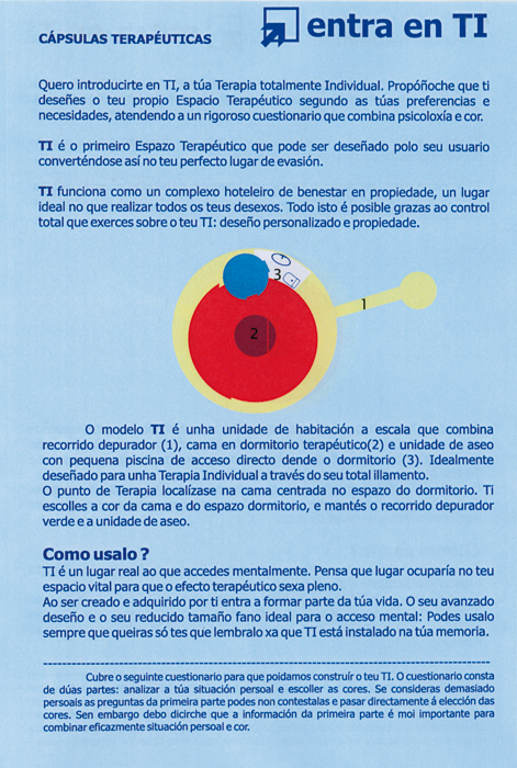 A innovadora terapia que che propoño incide na túa imaxinación e no teu subconsciente: se tes a oportunidade de cambiar segundo os teus desexos a habitación de hospital, o recordo que terás do teu paso polo hospital será o de ter permanecido na habitación modificada nunha maqueta.